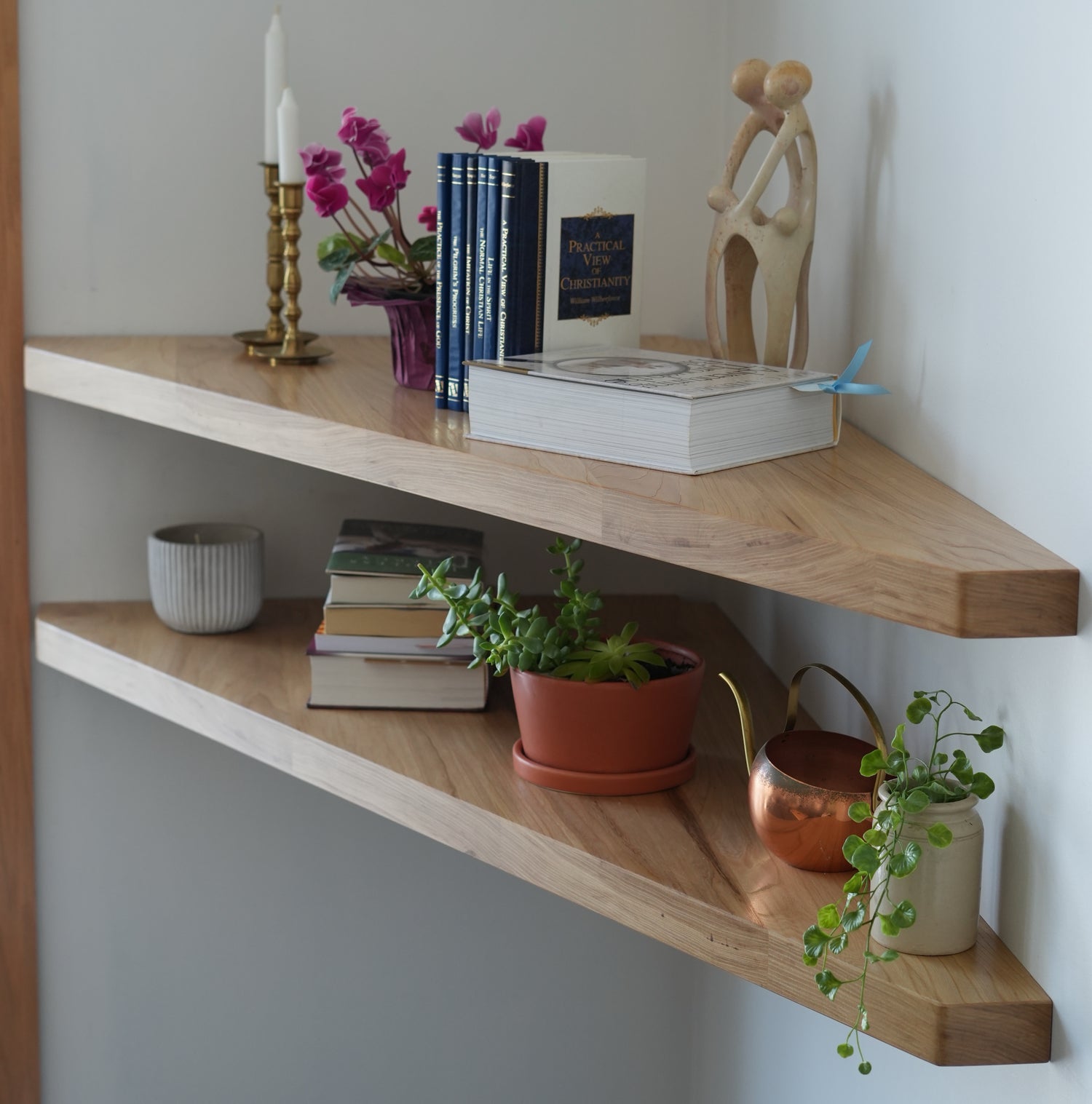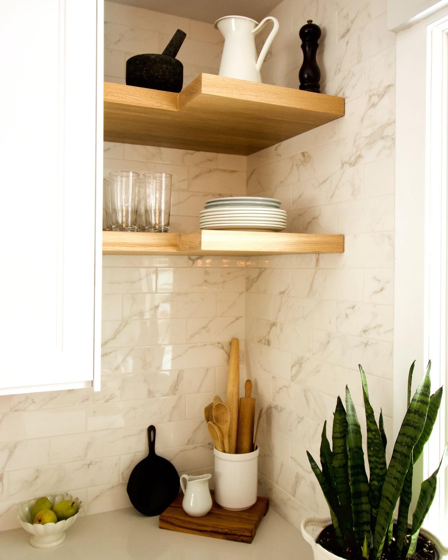 White oak kitchen floating shelves