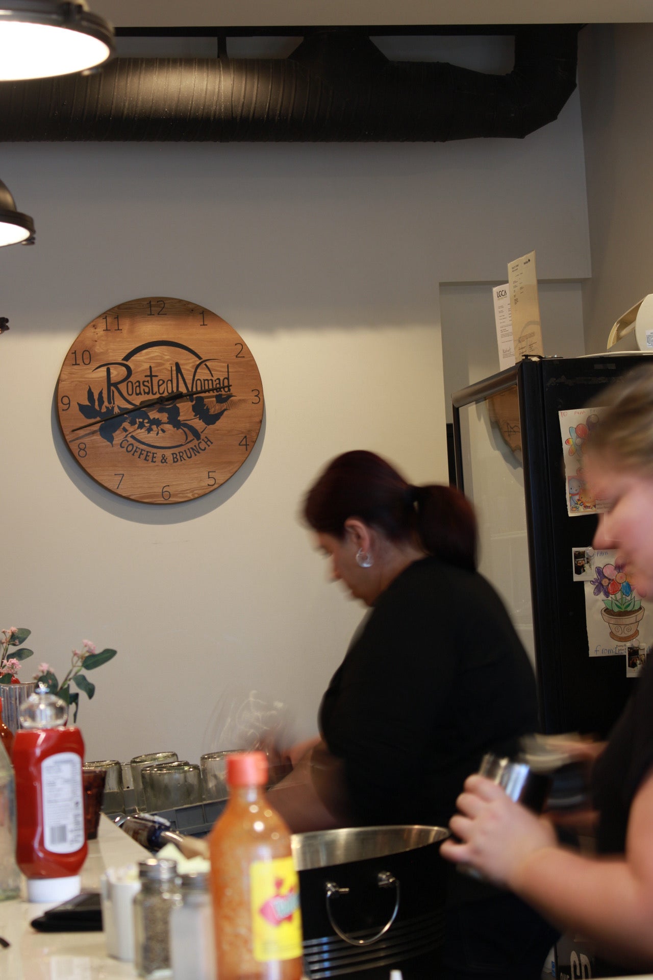 Large wall clock made for Roasted Nomad Coffee and Brunch Restaurant. Salvaged local white oak