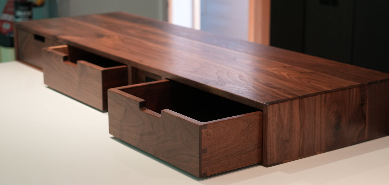 Walnut kitchen island-top drawer unit with integrated receptacle. Hand-cut dovetails on the drawer boxes